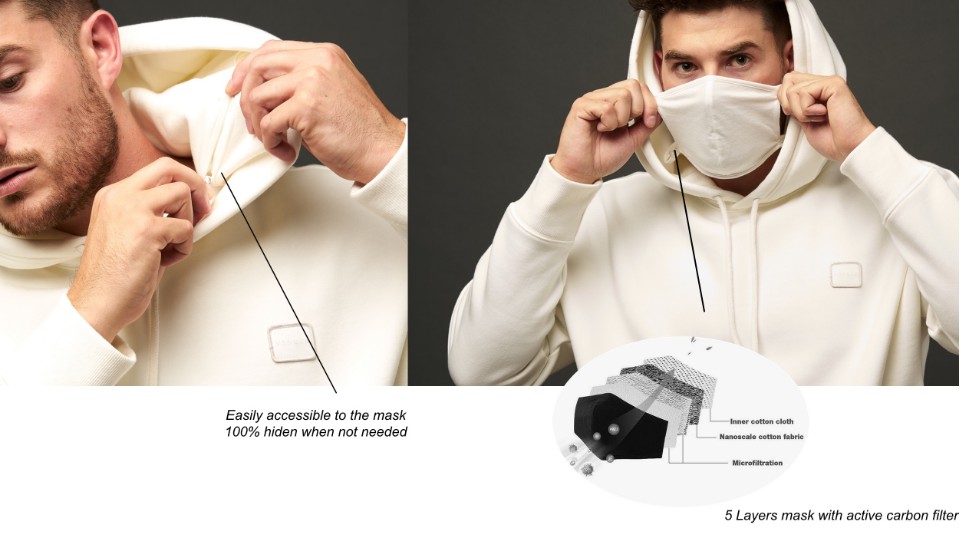 디자인 스튜디오는 2013년에 설립되었으며 여행자와 아웃 도어 애호가를 위한 가방을 만드는 회사였습니다. 하지만 코로나 사태가 벌어지고 나서, 아무것도 하지 않을 수 없다는 마음으로 후디 디자인을 만들게 되었다고 하네요. 2개월 동안 개발한 결과물은 꽤 스타일리시합니다. 앞으로 코로나가 언제 종식될지는 모르겠지만, 마스크 착용은 종식 후에도 계속될 것 같다는 생각이 듭니다. 그래서인지 캐나다 디자이너들이 만들어낸 이 후디가 무척 반갑게 느껴지네요. 현재 이 후디는 크라우드 펀딩 사이트에서 성공적으로 펀딩 모금 중입니다.