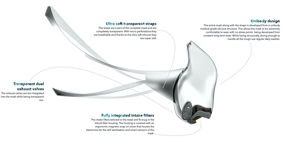'LEAF' 마스크는 UV-C 조명이 내장된 덕분에 N99 표준 공기 여과 기능뿐만 아니라 자가 정화 기능을 갖춘 세계 최초의 FDA 승인 투명 마스크입니다. 부품 대부분이 투명하게 만들어진 이 마스크는 턱 주변에만 필터가 달려져 있어 얼굴 대부분을 볼 수 있게 만든 점이 가장 큰 장점이라고 할 수 있겠네요. 이 마스크는 의료용 실리콘으로 만들어졌으며 이음새 없는 일체형으로 만들어져 보편적인 착용감을 제공하고 있습니다.