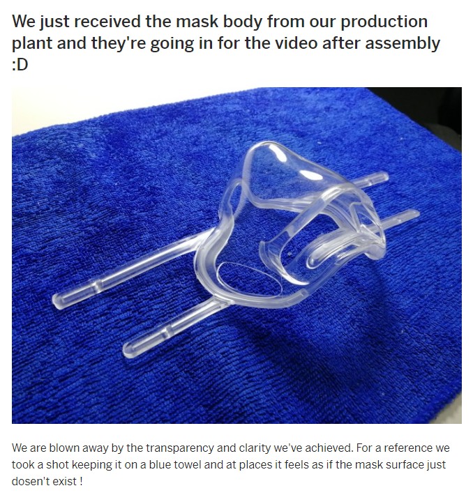 하지만 크라우드 펀딩을 진행하는 아이디어 상품들이 좋지않은 결과물을 내놓는 경우도 많아서 사람들은 과연 이 마스크가 홍보 사진처럼 만들어질 것인지 의문을 가지고 있습니다. 이들이 주장하고 있는 마스크가 되려면 마스크의 모양이 합성된 이미지처럼 가벼울 리가 없을 것이라는 의견도 심심찮게 들리고 있죠. 또한 배터리가 들어가는 전자 제품인데도 이에 관련한 사양 설명이 없고, FDA 승인은 되었다고 홍보하고 있지만 어떤 수준의 승인인지에 대한 언급도 없기에 문제가 되는 것 같습니다. 이런 수많은 의심에 답이라도 하듯, 업체에서는 실제 마스크 사진을 업데이트하며 사람들의 궁금증을 해결하려 노력하고 있습니다. 그러나 여전히 의심은 남습니다. 이들이 실제 제품을 후원자들에게 배송하기 전까지는 끊임없이 잡음이 들릴 것 같네요. 그래도 도전하는 이들이 성공적으로 투명한 마스크를 선보이기를 바라고 있습니다.