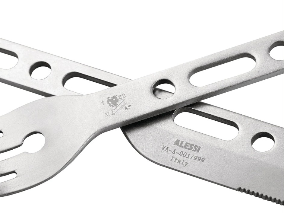 The cutlery set, made in Italy, in stainless steel, features geometric shapes and comprises a knife, fork, spoon and, importantly, a carabiner to fasten all three together, either in the context of a new way of setting the table, or as a means of attaching