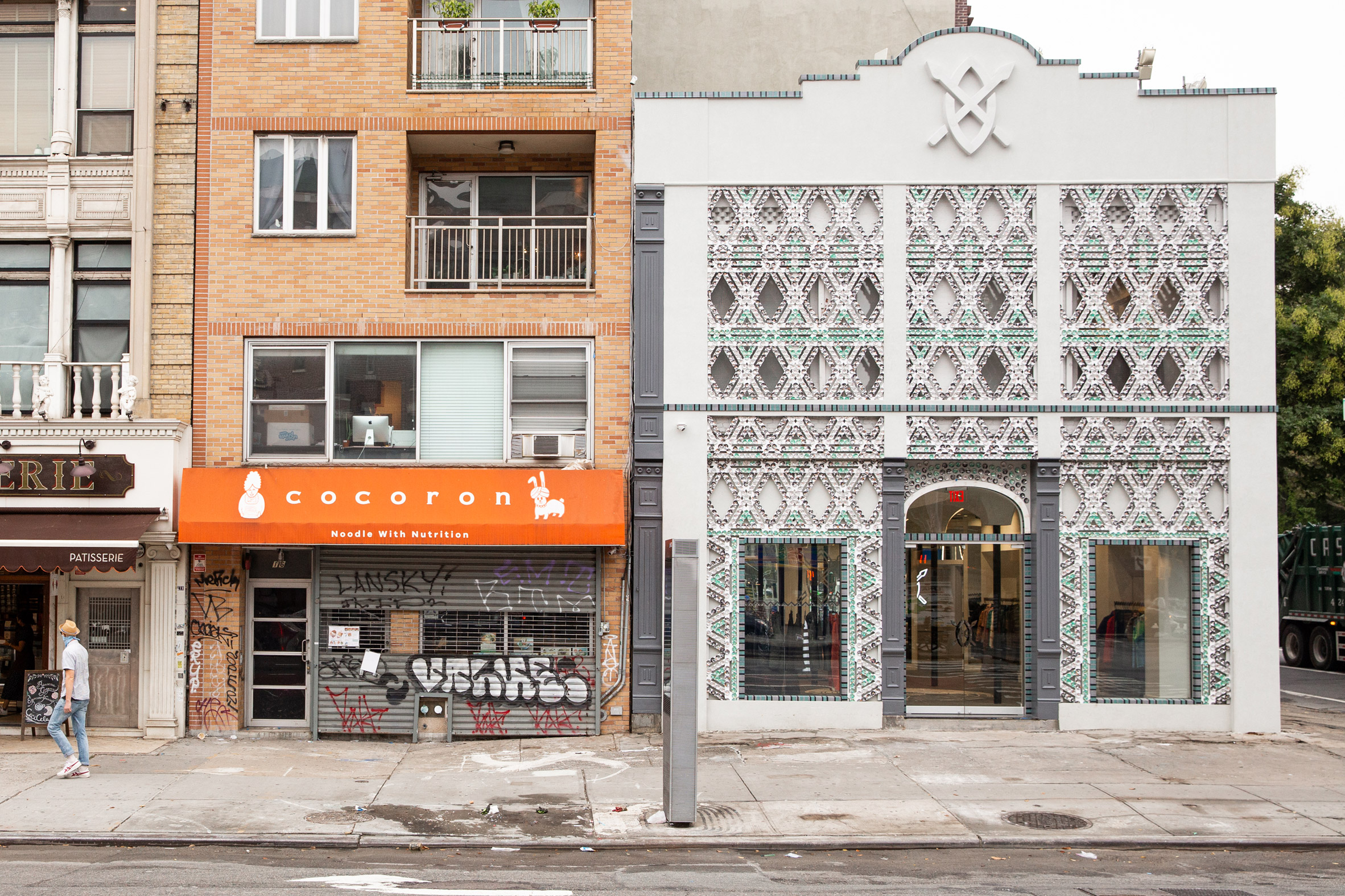 맨해튼의 로어 이스트사이드 거리의 코너 자리에 106제곱미터 (약 32평) 규모로 자리 잡은 이 브랜드 숍은 독특한 디자인으로 인해 눈길을 사로잡습니다. 건물 디자인을 맡은 포 플러스 디자인 (4plus Design)은 네덜란드의 전통적인 타운하우스의 모습을 본뜬 형태에 아프리카의 구슬 세공을 연상시키는 복잡한 격자 패턴을 입혀 브랜드의 기반을 표현하려 노력했습니다. 덕분에 어디서나 눈길을 사로잡는 디자인이 완성되었네요.