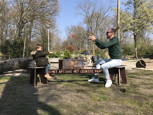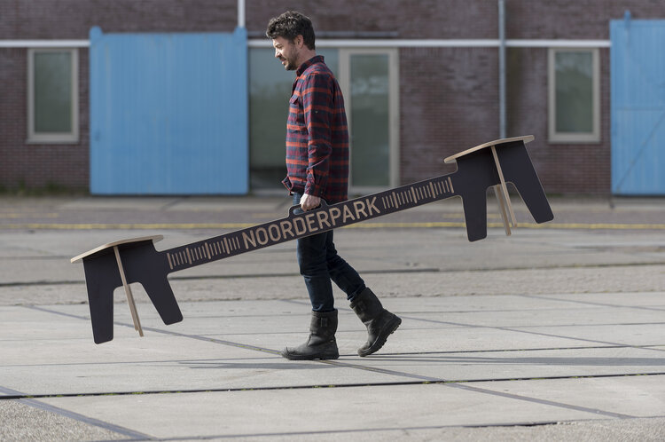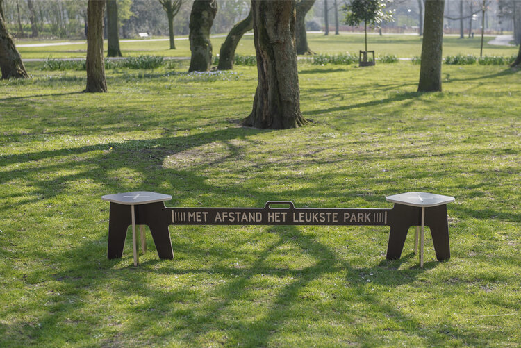 의자의 간격을 규정하는 가운데 부분에는 벤치가 설치되어 있는 암스테르담의 노르더 공원 (Noorderpark)의 이름과 더불어 'met afstand het leukste park(지금까지 가장 멋진 공원)'이라는 문구가 적혀있어 유쾌함을 더합니다. 오브젝트 스튜디오 창립자인 비요른 반 덴 브룩 (Björn van den Broek)은 올해 3월 코로나 바이러스가 네덜란드를 강타했을 때 네덜란드 정부가 국민들에게 타인과의 접촉을 엄격히 자제하고 서로 거리를 두도록 하는 지침을 설정했다고 말하며, 공원에 이 의자를 설치했을 때의 사람들의 반응이 뜨거웠다고 밝혔습니다. 어딜 가나 사회적 거리두기는 어려운 일이었나 봅니다.